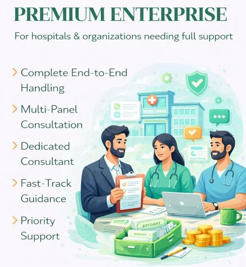 Our Premium Enterprise Pack is designed for hospitals and organizations, offering dedicated consultancy, multi-panel support and priority processing for smooth and fast empanelment.